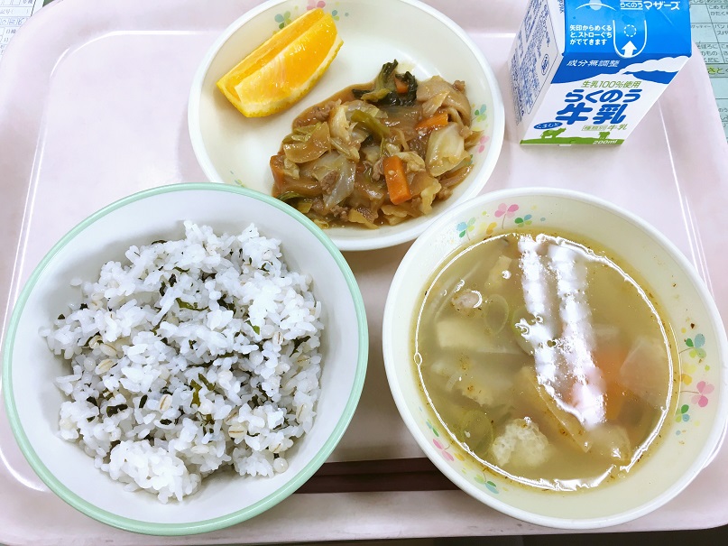キャベツと豚肉のみそ炒めが1番おいしかったです。他のわかめご飯と白玉だんご汁とオレンジもとてもおいしかったです。(6年生)