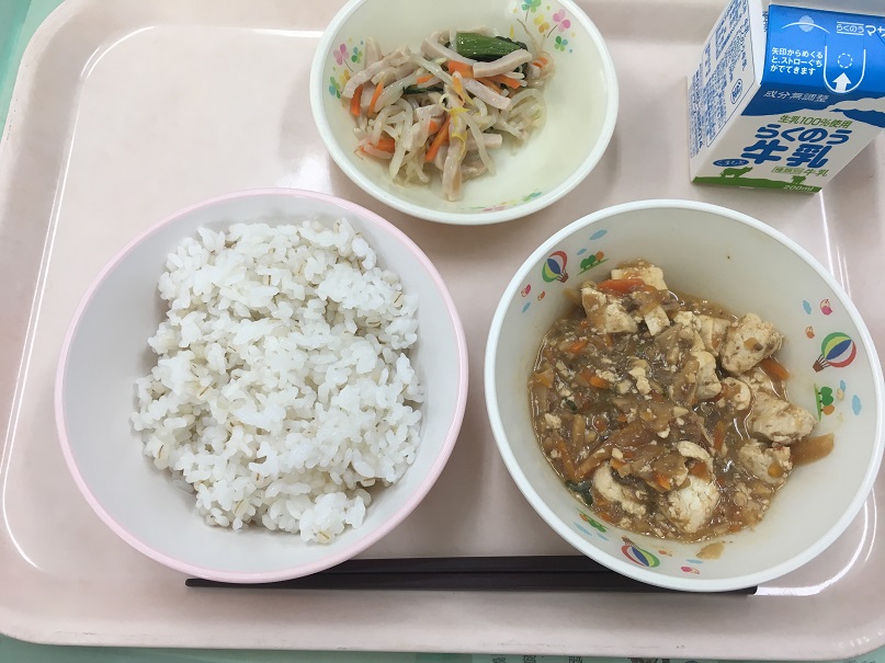 もやしの中華和えがおいしかったです。むぎごはんもとてもおいしかったです。マーボー豆腐は苦手だったけど、食べてしまいました。(2年生)
