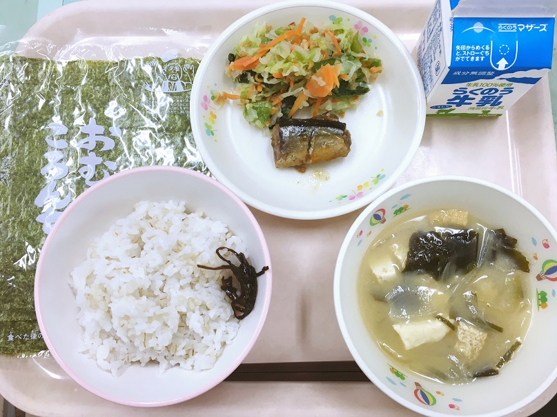 おにぎりとさんまが好きでした。アーモンド和えは、おかわりしてたべました。(1年生)