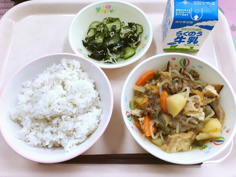 今日は、地元の赤牛を使って、肉じゃがを作りました。地元の食材を給食に取り入れることができ、まさに「地産池消」だと思います。