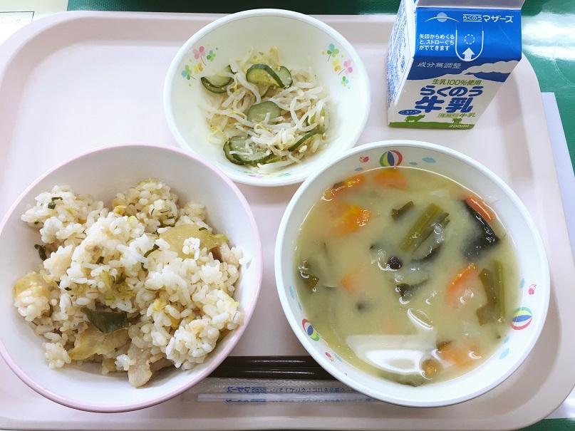 今日は、キムタクご飯を作りました。キムチとたくあんが入っているため、「キムタク」という名前が付いたそうです。始めは、長野県の学校給食で作られていましたが、「おもしろい!」「おいしい!」と話題になり、全国の学校給食に広まりました。