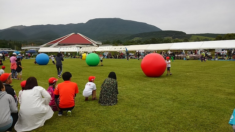 玉がたくさん入ると「くまモン」が空高く上がります。早く「くまモン」