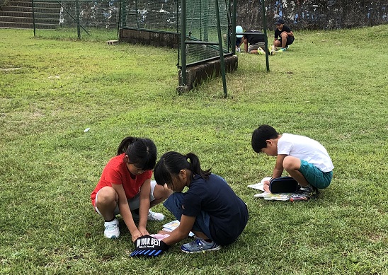 3年生が理科の授業で、秋の昆虫がどんな場所でどんなことをしているのかを調べに行くと、1,2年生も秋の虫を探していました。
