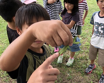 運動場の芝の上にはコオロギやバッタ、カマキリなど、いろいろな昆虫がいました。