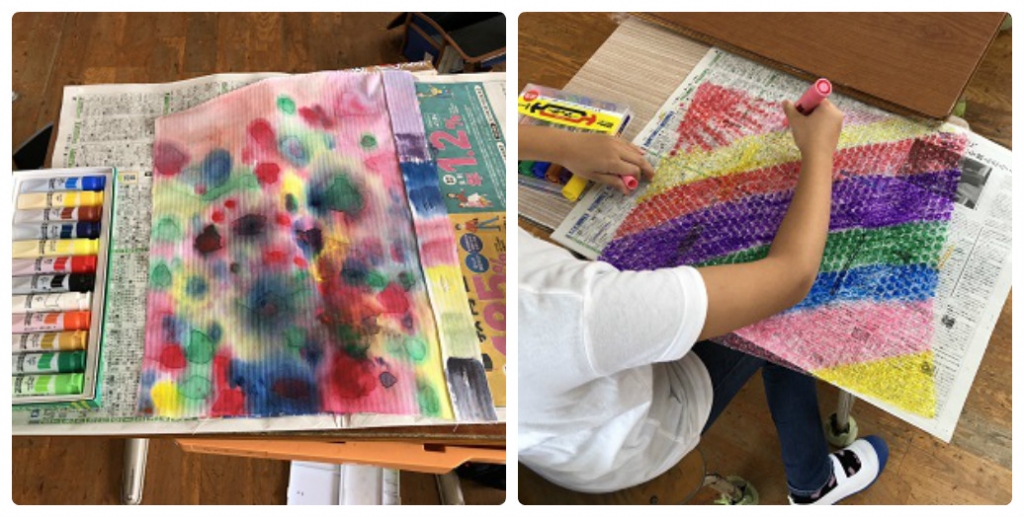 他にも梱包に使うプチプチシートやタオルなど、いろいろなものに色を塗って楽しんでいた3年生でした。