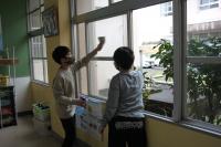 窓を拭きながら、白水小学校でのたくさんの思い出を振り返っていた6年生ですにっこり