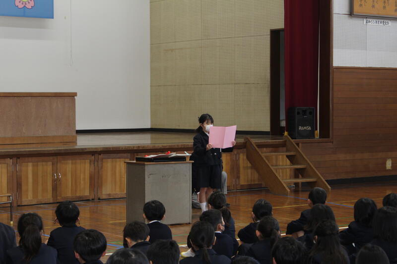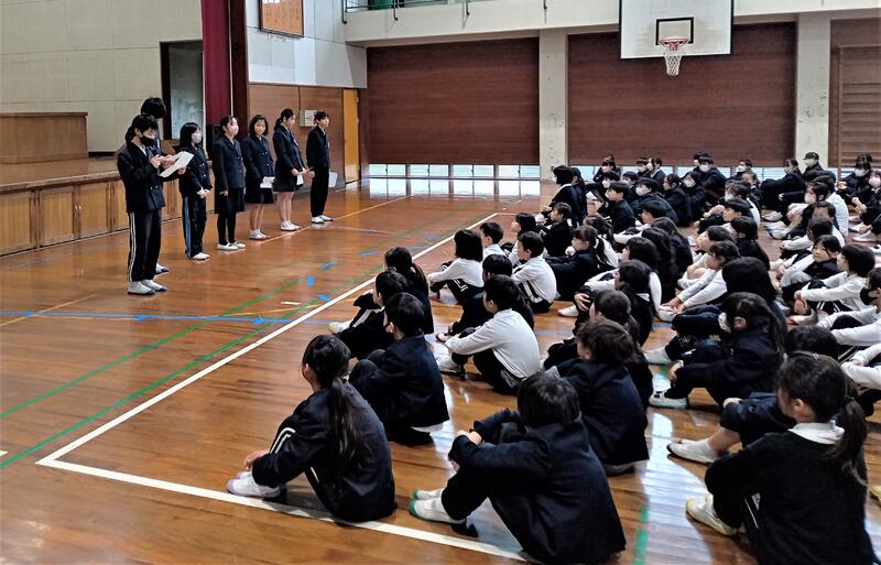 2月14日(水)の児童集会では、それぞれの委員会より、1年間の活動報告がありました。今年度は、無言掃除やスリッパ並べなど、「腹赤っ子ならできる5つのABC」の課題解決へ向けての取組や体育委員会企画の定期的な「〇〇大会」など、各委員会活動で工夫した取組があり、子どもが活躍する場面を多く見ることができました。校内放送では、毎日のように多くの発信があります。1年間頑張ってくれた6年生、そして5年生のみなさん。ありがとうございました。