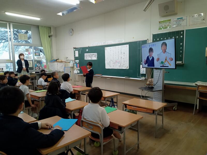 11月25日(月)、手話サークル「わかぎ」の皆様(8名)にご協力いただき、4年生が「手話教室」を行いました。体験的に学習することができ、子供たちは意欲的に取り組んでいました。
