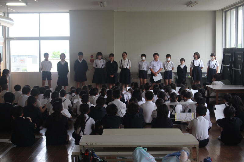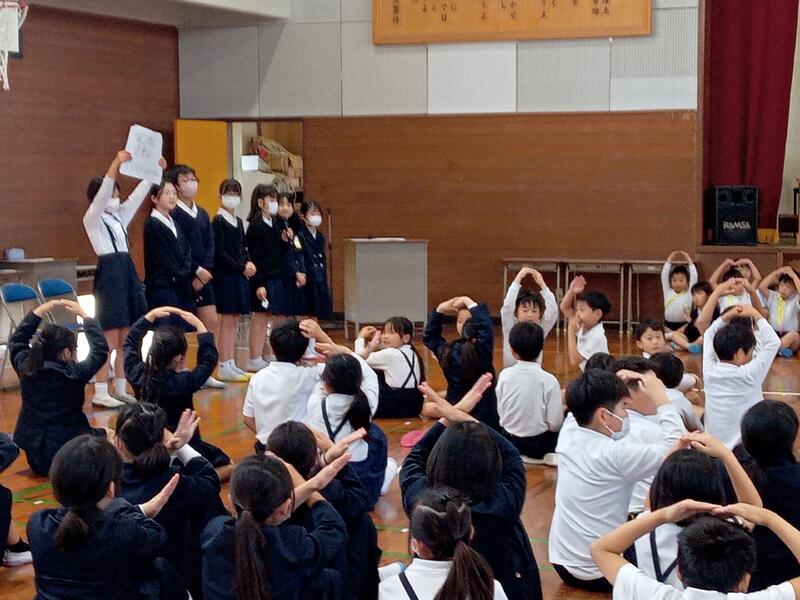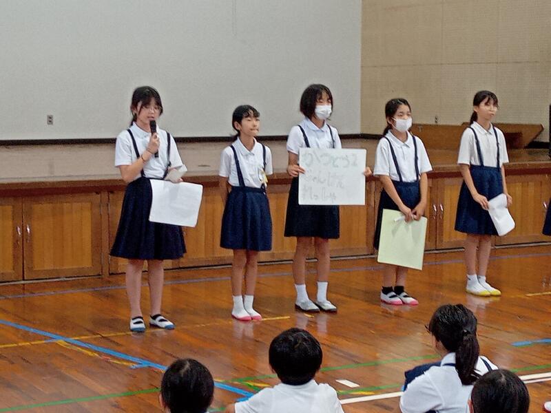 10月16日(水)の児童集会は、環境委員の発表でした。学校版環境ISO宣言の項目である「こ れ で 花 ま る」について説明がありました。返しの言葉がたくさんあり、「腹赤小みんなで、 これで花まる を守っていきたいです」といった感想がありました。