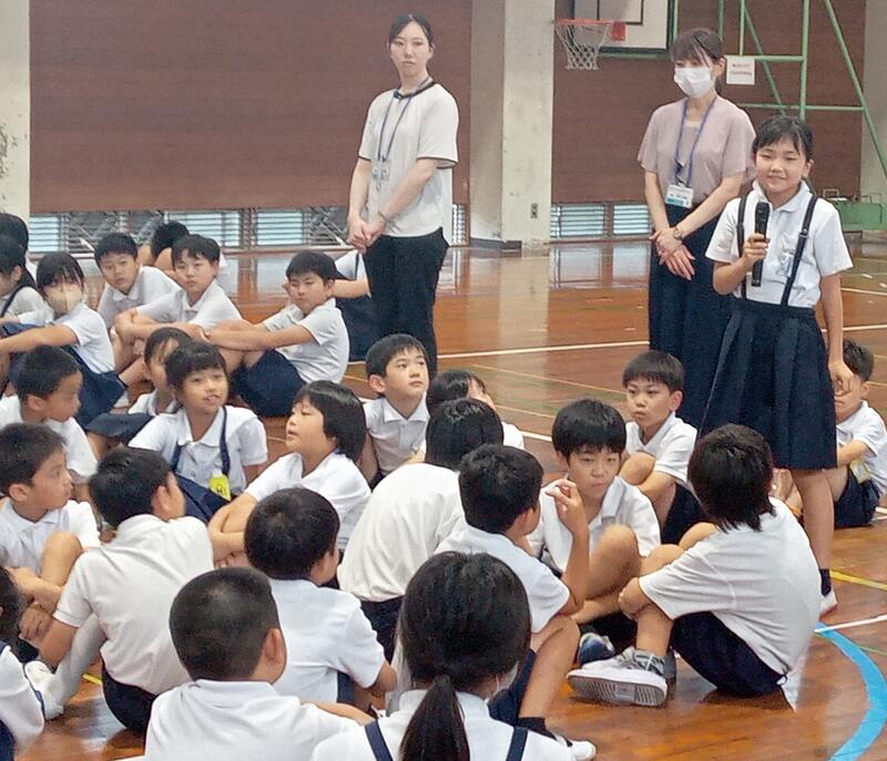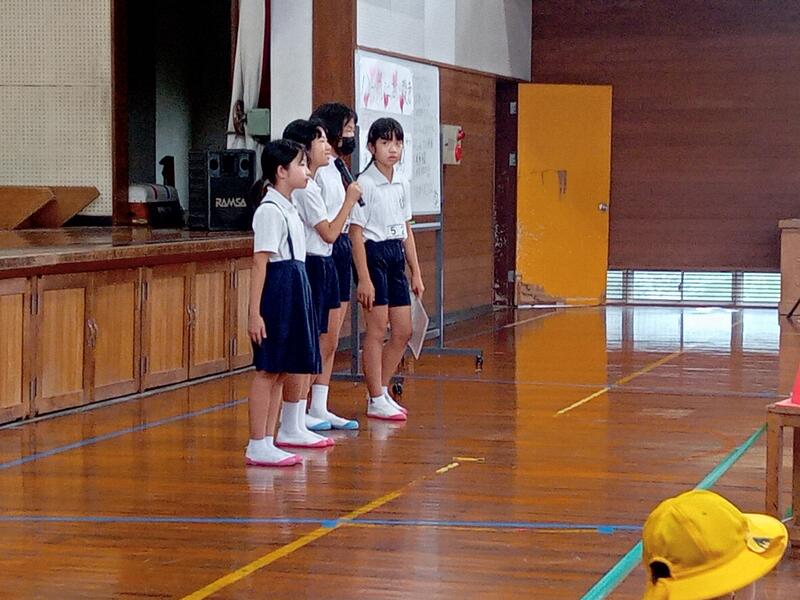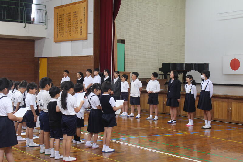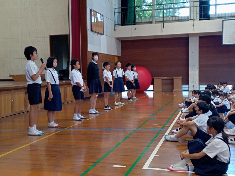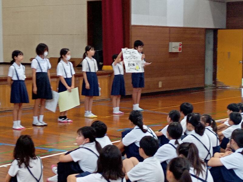 9月18日(水)の児童集会は、放送委員会の発表がありました。「今月の歌」に関するクイズがありました。本校では、毎朝始業時間に「今月の歌」を流し、クラス毎に歌っているので、多くの児童が答えることができました。また、この日は、運営委員会より、今取り組んでいる「地域へのあいさつ運動」について、よくできている登校班の紹介もありました。