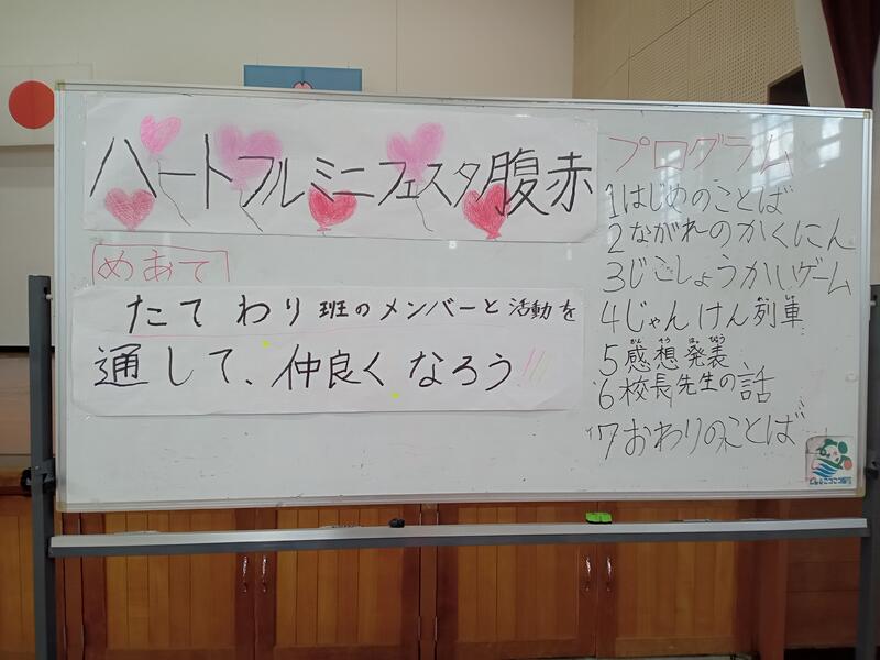 4月19日(金)、1年生を迎える会がありました。入学して1週間が過ぎましたが、楽しく学校で過ごしています。自己紹介では、好きなものや将来なりたいことを発表してくれました。また、腹赤小クイズや5年生からメダルのプレゼントがあり、楽しく交流ができました。運営委員が会の進行や1年生のお世話をしっかり頑張ってくれました。