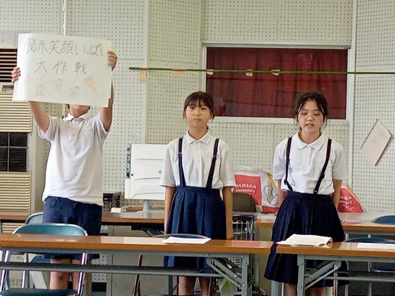 7月11日(木)、第2回学校運営協議会が開催されました。今回の協議会には6年の児童代表3名が出席し、腹赤小校区を笑顔にするための取組を「腹赤笑顔いっぱい大作戦」と名付け、協議会委員の方々に発信しました。代表児童は、自分たちにできることを提案し、委員の方々から、様々なご意見やご助言をいただきました。今回提案したことは以下の3点です。