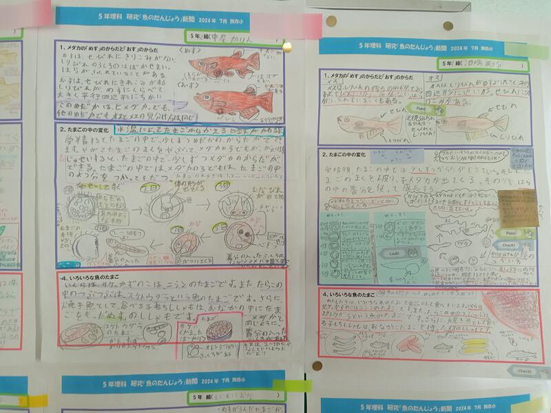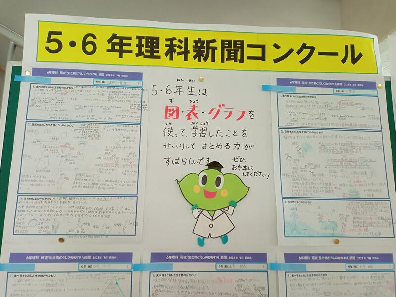 児童玄関から入ってすぐの掲示版に「5・6年理科新聞コンクール」の作品が掲示されています。6年は「生き物どうしのかかわり」について、5年は「「魚のたんじょう」について、理科で学習したことをまとめていました。図や表、グラフを使ってまとめており、すばらしい作品ばかりです。