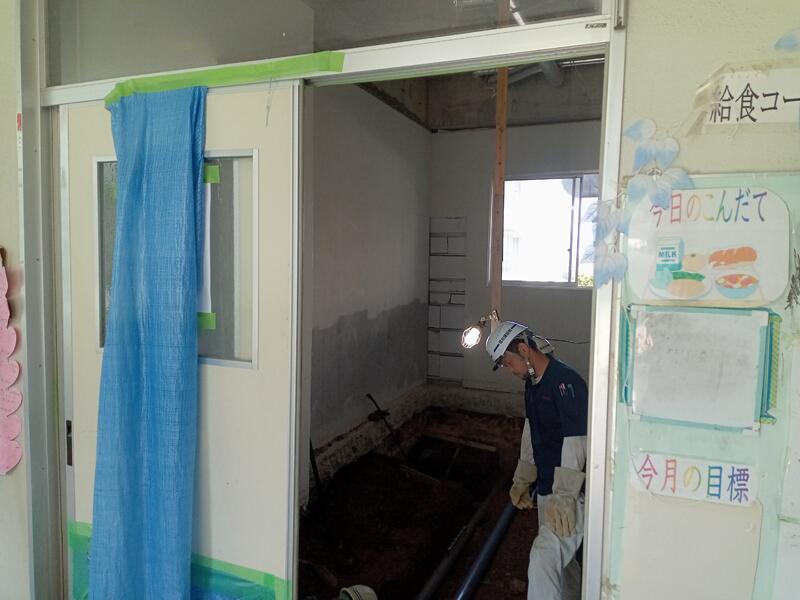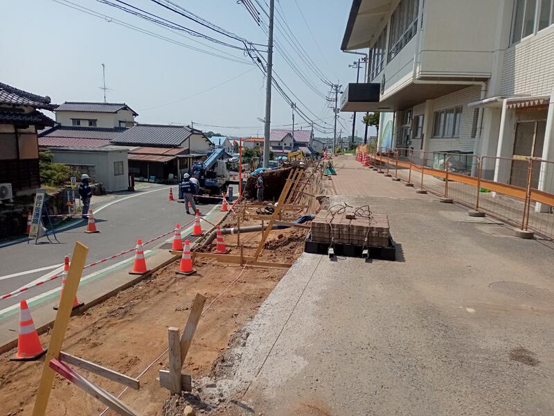 毎日猛暑が続いていますね。熱中症には十分留意されてください。さて、夏休み中に本校では3つの工事が行われています。1つ目はご存じかと思いますが、学校前の歩道整備のための工事です。道路拡張に伴い、以前の擁壁が撤去され、玄関の様子が随分と様変わりしています。2つ目は多目的トイレ新設の工事です。1階低学年トイレ横の資料室が多目的トイレにかわります。3つ目は備蓄倉庫設置の工事です。体育館と低学年等の間に設置されます。順に工事の様子を写真で紹介します。
