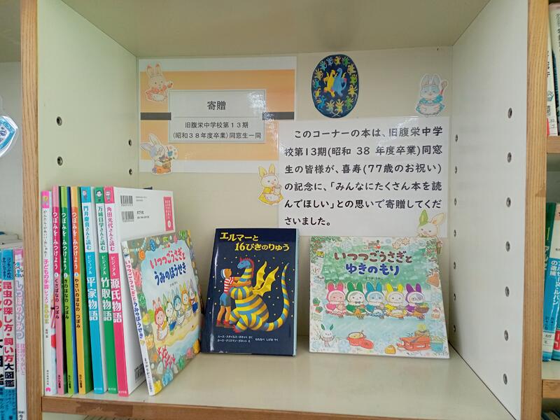 広報ながす8月号に掲載されていましたが、旧腹栄中学校第13期(昭和38年度卒業)同窓生の皆様方が、喜寿を記念して六栄小学校と腹赤小学校に学校図書を寄贈されました。そこで、夏休み中に寄贈図書コーナーを学校の図書室に設置しました。夏休み明けにたくさんの子供たちに読んで欲しいですね。