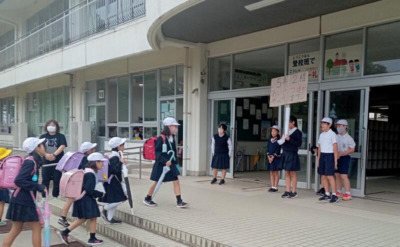 10月29日(火)、朝から児童玄関前で子供を迎えていたときに、5年2組の児童数名があいさつ運動を始めました。担任に聞いたところ、国語「よりよい学校生活のために」の単元の中で、クラスで話し合い、あいさつ運動をすることに決まったそうです。おかげで、いつも以上にあいさつの声が響いていました。