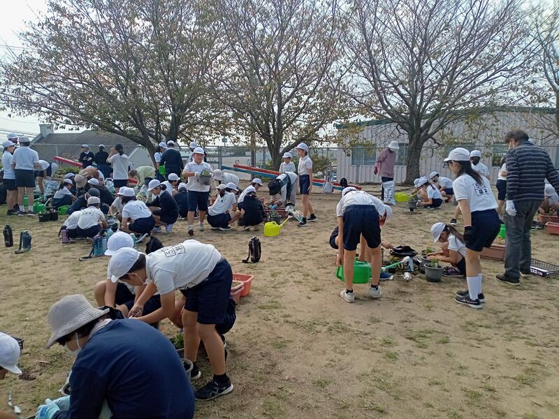 11月5日(火)に地域交流花植えを実施しました。校区の老人会の方々にご協力いただき、5・6年生児童と一緒にプランターや鉢にパンジーやビオラなどを植えました。地域の方々と温かい交流ができました。ご協力いただいた皆様方、ありがとうございました。