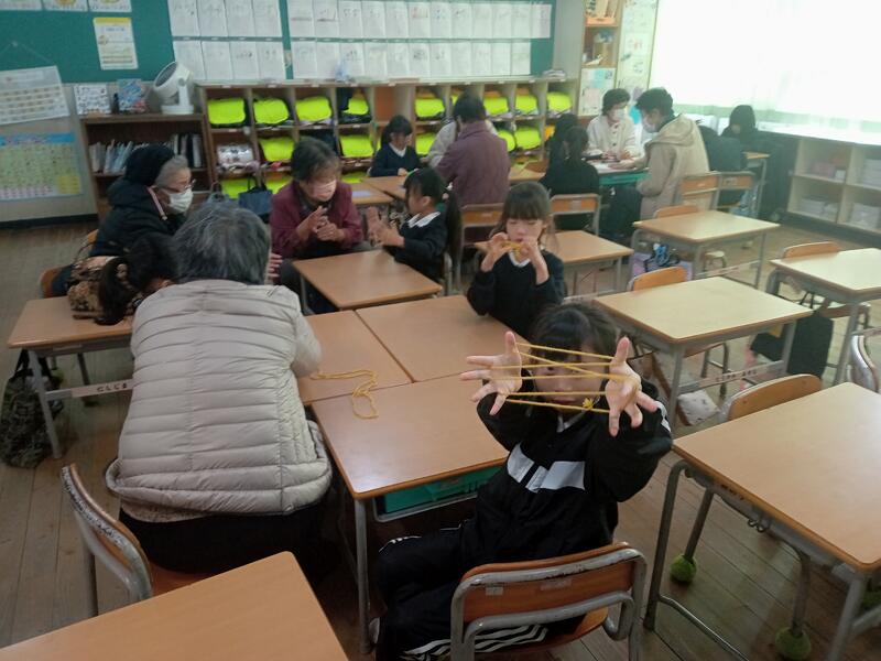 1月17日(水)、1年生が昔遊び体験を行いました。腹赤小校区老人会代表の西林亘様をはじめ12名の老人会の方々にご協力いただき、こま回しや竹馬、竹とんぼ、あやとり、おはじき、折り紙の遊び方を教えていただきました。地域の皆様方のご協力で貴重な体験ができます。ありがとうございました。