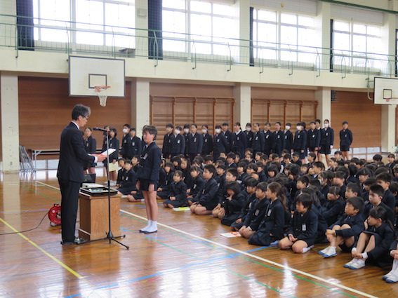 最初に、日頃から大変お世話になっている,登下校の見守り隊の方々、読み聞かせの皆さん、まるつけボランティアの皆さんに,感謝の気持ちを表す「感謝状贈呈」を行いました。