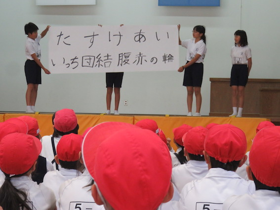 今年のスローガンは「たすけあい いっち団結 腹赤の輪」です。みんなで力を合わせて運動会を成功させようという気持ちがしっかり伝わってきます。