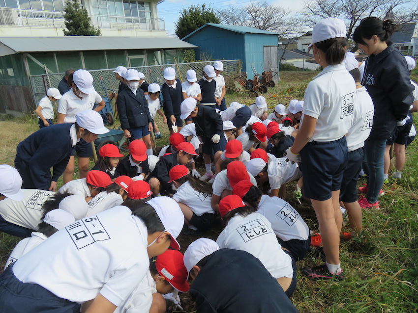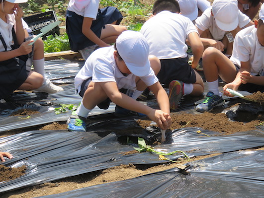 1年生から6年生まで地域の方に耕していただいた畑にさつまいもの苗を植えていきます。