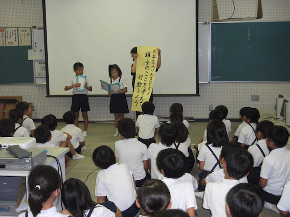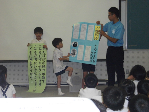 児童会の企画委員会の司会進行で、熊本県人権子ども集会に参加して学んだこと、人権学習を通して学んだこと、感じたことをを学年ごとに発表しました。