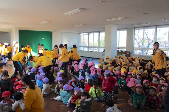 地震発生の校内放送でスタートした訓練は、津波発生を想定した避難、児童・園児の保護者への引き渡しと状況が刻一刻と変わる想定で行われました。