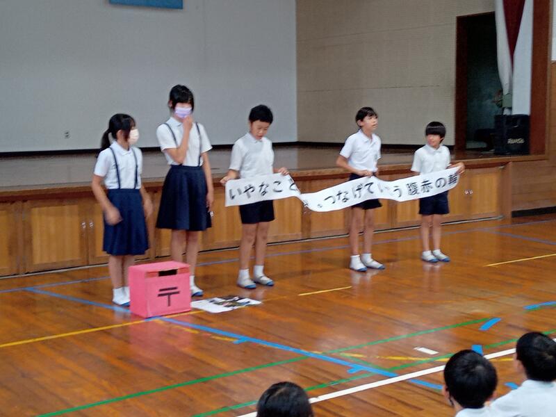 6月28日(水)の児童集会は、運営委員会の発表でした。先日の代表委員会で決定した人権スローガンを発表した後、「友だちのいいところ探し」について説明がありました。スローガンは「いやなことゼロ つなげていこう 腹赤の輪」です。いじめのない、思いやりとやさしさにあふれる学校にしていきましょう。
