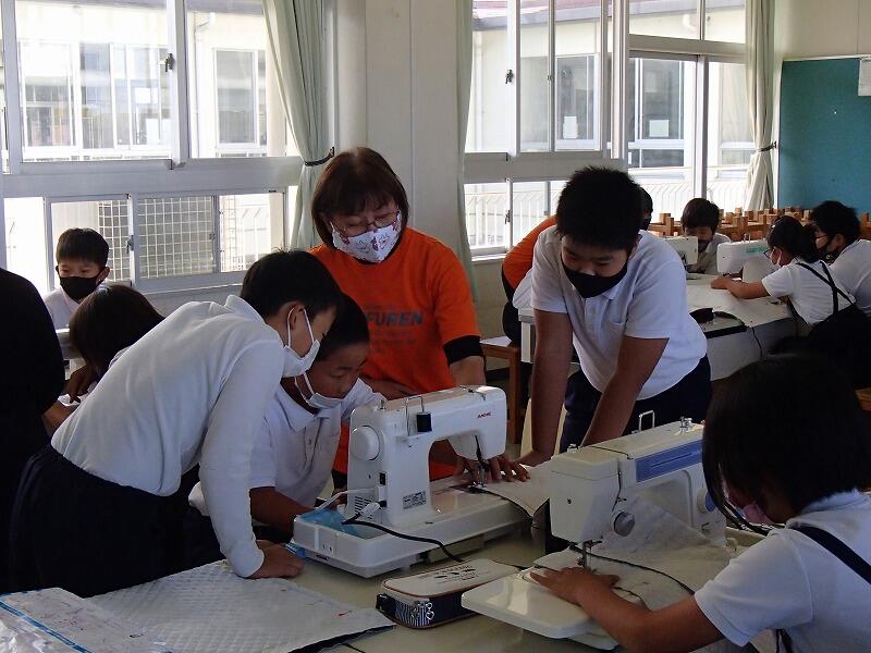10月18日(月)から3回、5年生の家庭科「ナップサックづくり」に、地域の婦人会に来ていただき、