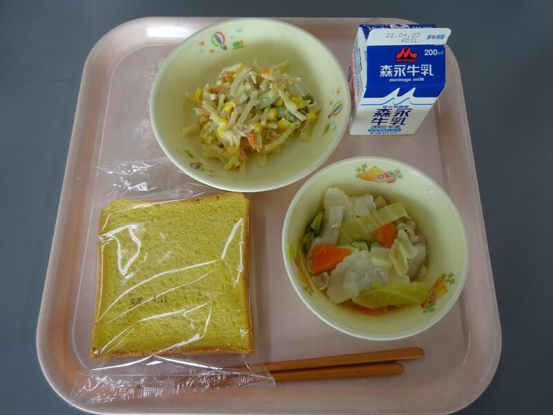花丸今日から子供たちが楽しみにしていた給食が始まりました。メニューは「にんじんパン、ラビオリスープ、ツナじゃがソテー、牛乳」でした。子供たちは協力して準備をすると、「黙食」でマナーよく、おいしそうに食べていました。給食センターの先生、1年間大変お世話になりますキラキラ