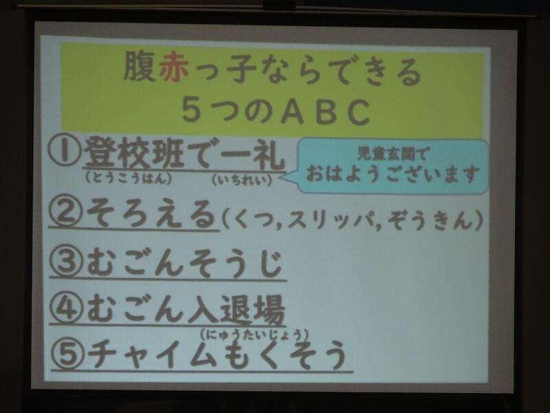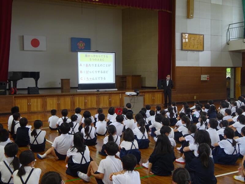花丸全校集会を開きました。校長先生が全校児童に「腹赤っ子ならできる5つのABC」についてのお話をしました。「①登校班で一礼②そろえる(くつ・スリッパ・ぞうきん)③無言掃除④無言入退場⑤チャイム黙想」の5つのことを「Aあたりまえのことが、Bびっくりするほど、Cちゃんとできる」ように、取り組んでいきましょうキラキラ