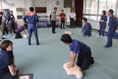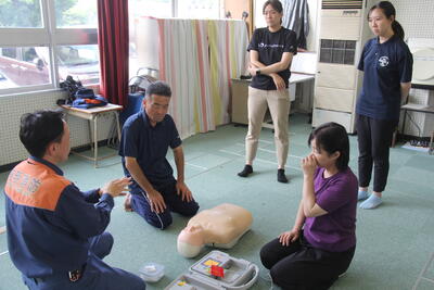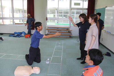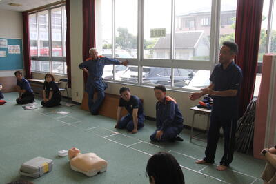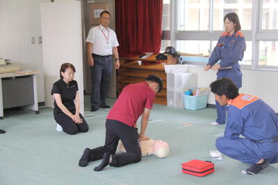 毎年、プールの授業を始める時期の前に、消防署から講師を招いて救急救命法の研修を行っています。
