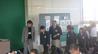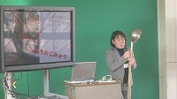 そして給食集会です。給食委員会の発表のあと、荒尾市学校給食センターから講師の先生をお招きし、給食センターの1日や、毎日の献立についてのお話をしていただきました。