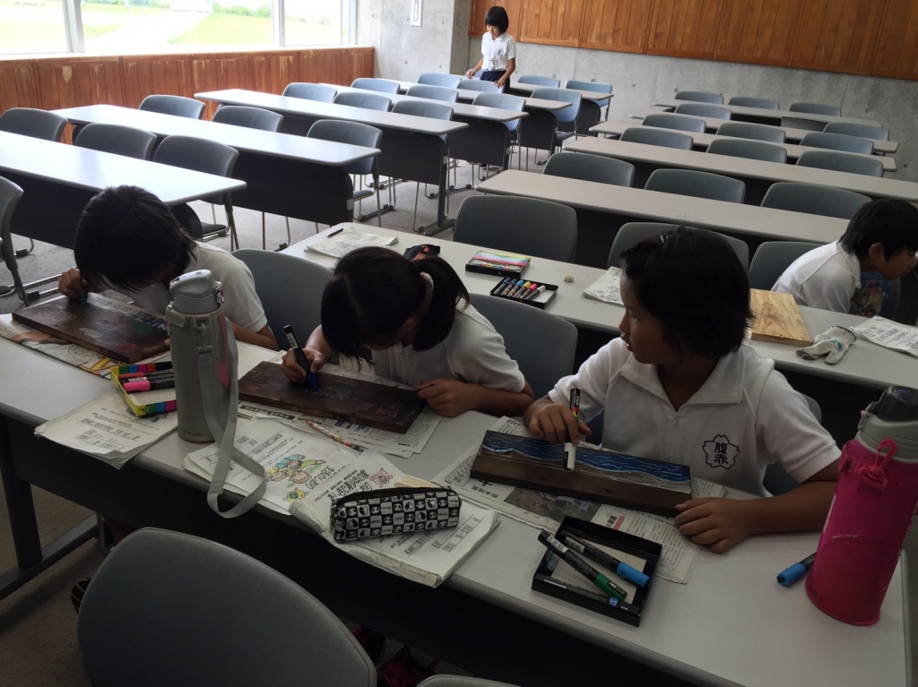 7/16 午前中:雨天のため予定されていたローラールージュが行えませんでしたが、子どもたちは焼き杉を頑張っています。
