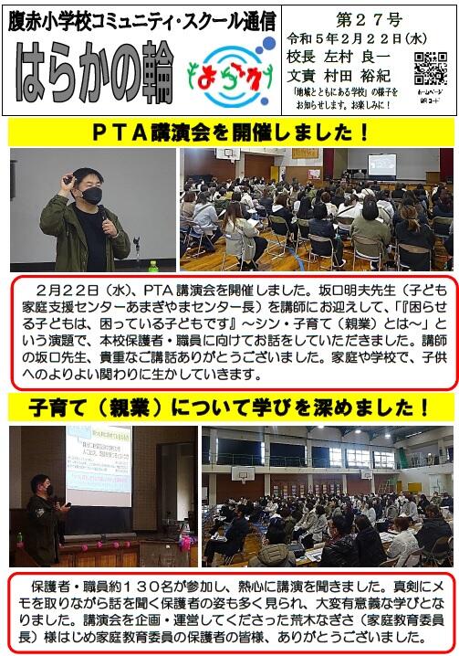 コミュニティ・スクール通信第27号「PTA講演会」を発行しました。「はらかの輪」では、本校の「地域とともにある学校」の取組や様子をお知らせいたします。どうぞお楽しみに!本ホームページ「コミュニティ・スクール」をご覧ください