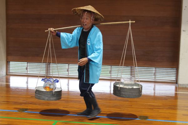 全国でただ一人の金魚のふれ売り師である浦島義弘さんにおいでいただき、伝統の金魚のふれ売りを体験しました。金魚にかかわる様々なお話を聞いたり、実際に天秤棒を担いで歩いてみたりとすることができました。