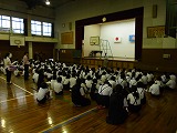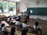 校内に不審者が侵入したという想定です。職員は非常時の連絡体制、防衛体制、児童の誘導のしかたを確認します。