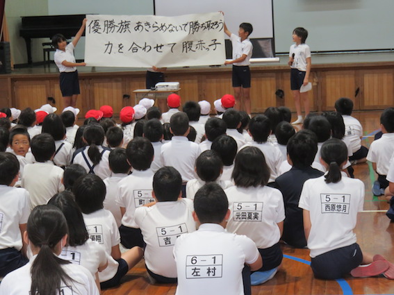「優勝旗あきらめないで勝ち取ろう 力を合わせて腹赤っ子」というスローガンで、思い出に残る運動会になるようにがんばります。