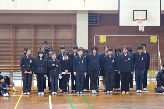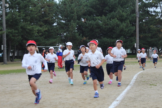 持久走大会を町民グラウンドで行いました。当日は曇り空で霧雨が降り、少し寒さを感じる天候でした。
