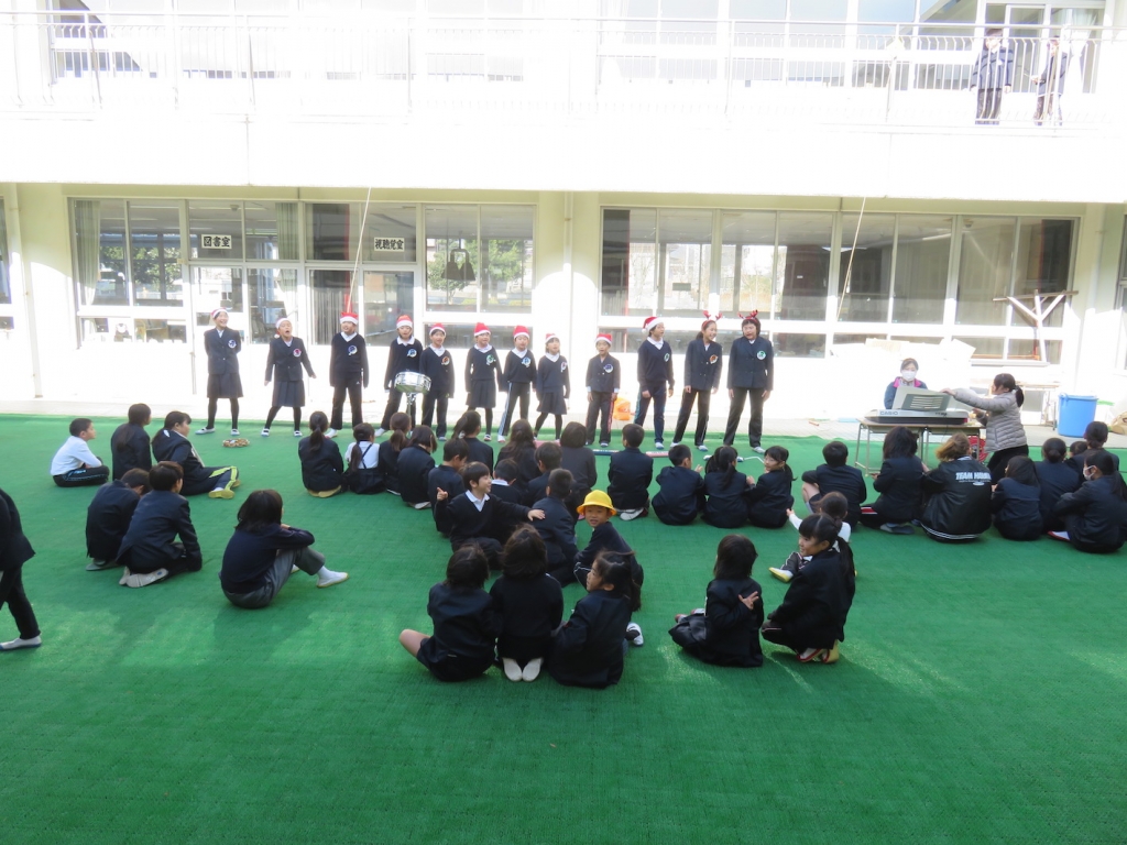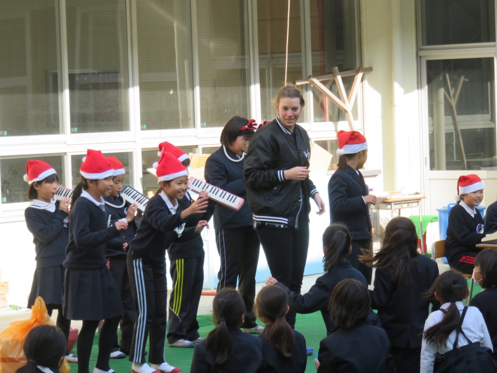 クリスマスにちなんだ歌や演奏を披露してくれました。大盛り上がりで、ギャラリーからたくさんの手拍子を受けていました。レベッカ先生もいっしょに参加してくださいました。