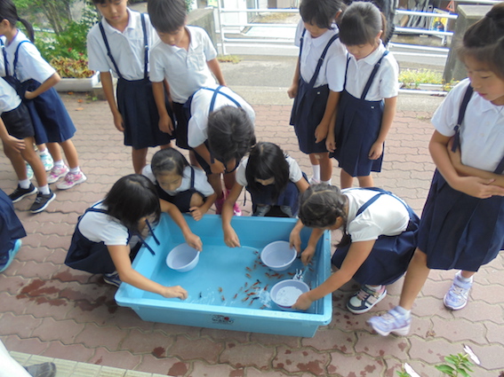 3年生が、長洲町の金魚についての学習をしました。総合的な学習の時間で、金魚養殖について専門家から詳しく話を聞きました。最後に金魚すくいも体験しました。