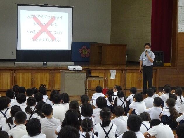 6月の全校集会を開きました。6月は「心のきずなを深める月間」です。校長先生が、「ひとつのことば」の詩(北原白秋作)を紹介され、「いじめのないみんな仲のいい学校にしましょう。そのために言葉を大切にしてください。人を笑顔や元気にする、励ます言葉かけをしましょう」とお話をされました