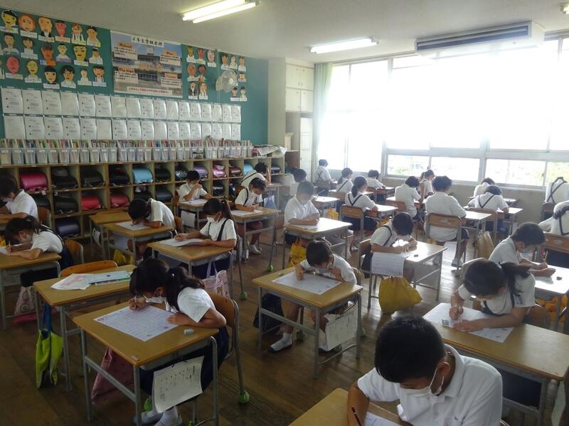 基礎学力の定着のために、全校で「漢字(ひらがな)・計算大会」を実施しました。子供たちは夏休みに勉強してきた、漢字(1年生はひらがな)や計算の問題を一生懸命解いていました。「あっ!」という間に解き終える子、何回も丁寧に見直しをする子もいて感心しました。夏休み中の頑張りの成果が見られましたね
