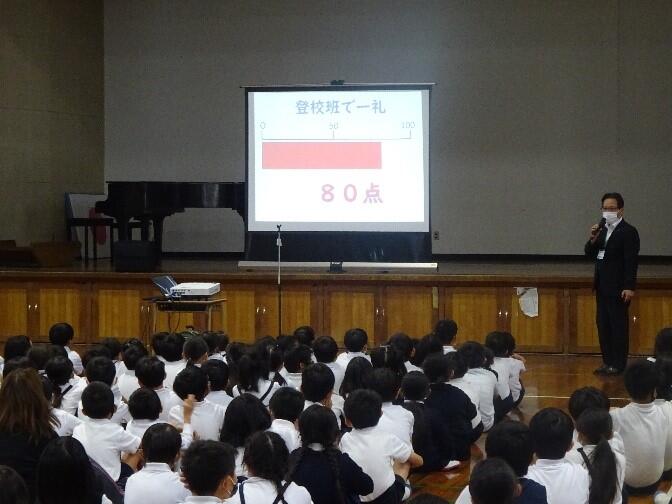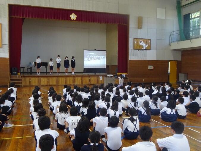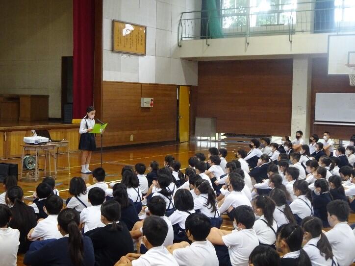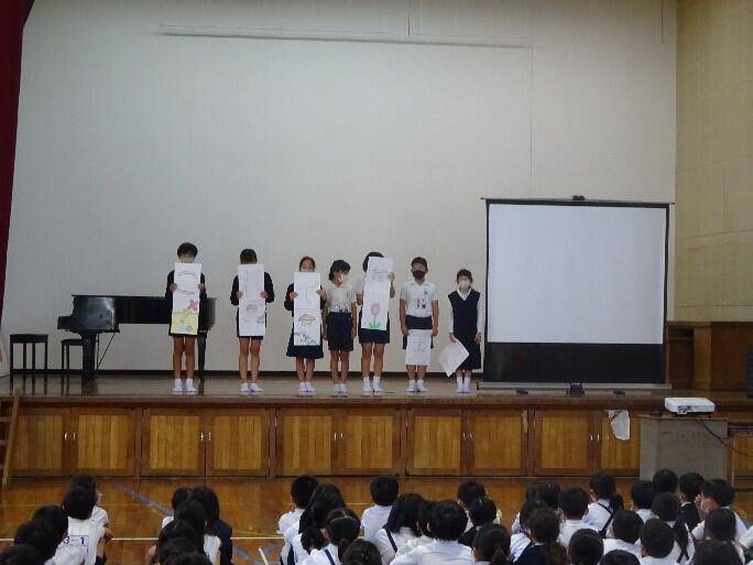 花丸児童集会を行いました。運営委員会からは「登校班で一礼」「チャイム黙想」について、動画をもとに気づきを出し合い、考える発表がありました。環境委員会からは、節水、節電、リサイクル、残菜0、栽培活動、無言掃除の呼びかけの発表がありました。コロナ禍で3年ぶりの参集型の児童集会の実施でしたが、堂々とした発表やお返しの感想もできて、とてもよい集会でしたキラキラ