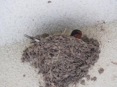 現在、職員室軒下で、ツバメが両親が交代しながら巣の中で卵を抱いています。