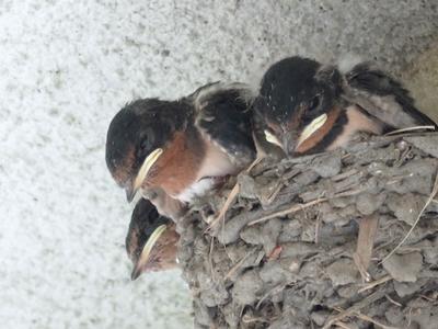 右の写真は、8月5日のようすです。外の様子に興味津々という様子がうかがえます。羽も立派に生えそろい、親ツバメと見分けがつかないほどになりました。