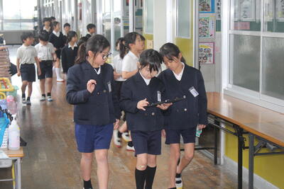 6年生を見つけたら、タブレット端末で一緒に撮影します。