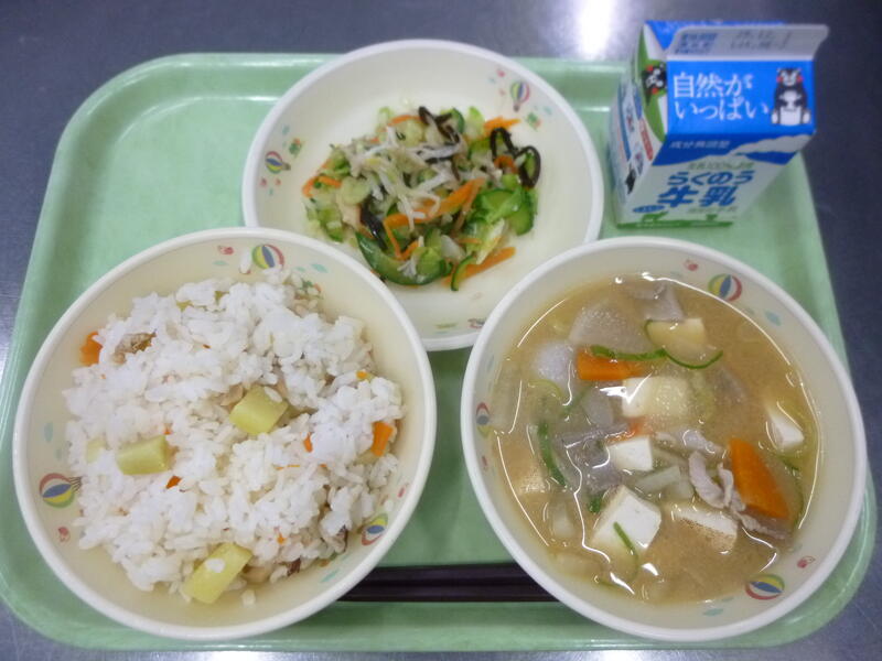 ☆秋味ご飯 ☆牛乳 ☆豚汁 ☆きゅうりとささみの塩こんぶあえ