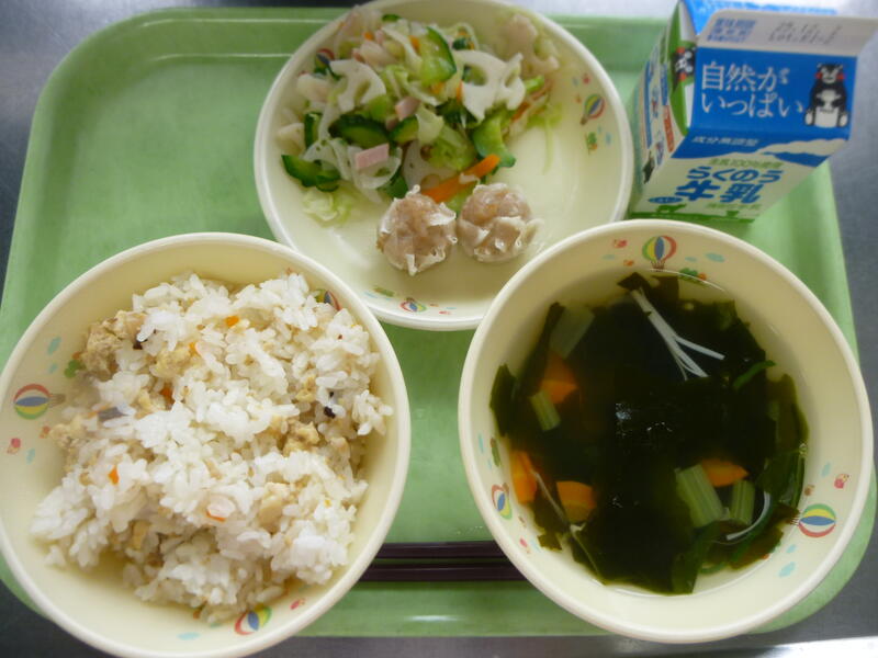 ☆びりん飯 ☆牛乳 ☆しらたま汁 ☆焼売 ☆レンコンサラダ
