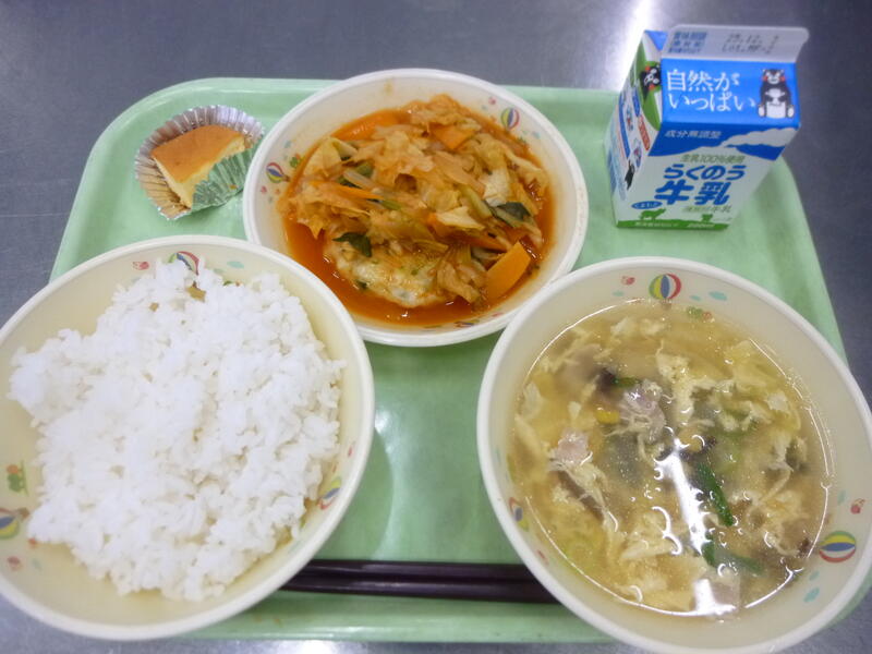 ☆ご飯 ☆牛乳 ☆スーミータン ☆イカバーグのチリソースやき ☆一口ケーキ